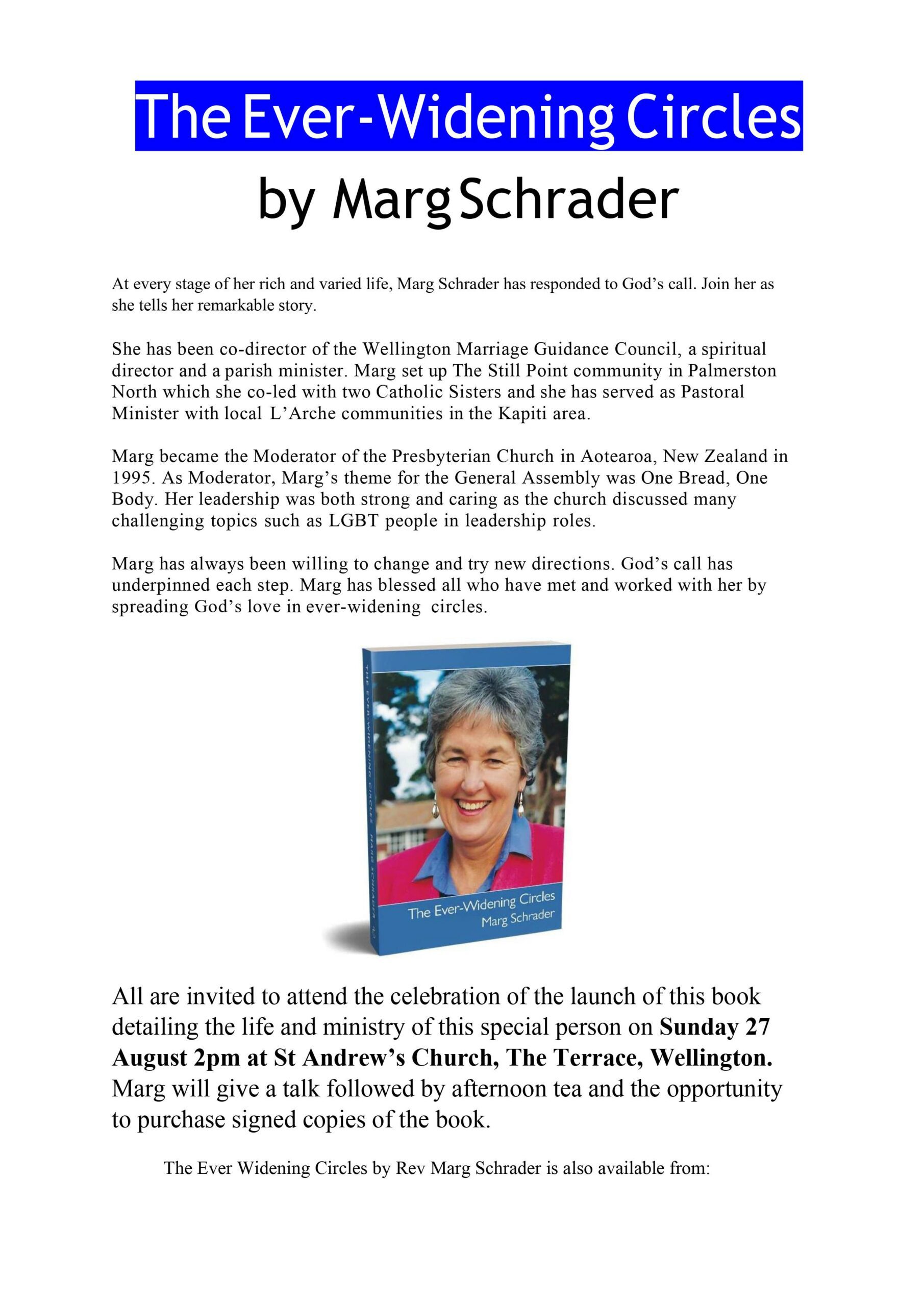 Minister emeriti Rev Marg Schrader is having her book launch “Ever Widening Circles” (it is her biography) at St. Andrew’s on the Terrace on the 27th of August at 2pm. We are asking people to RSVP if they intend on attending her launch. SAOTT is catering for it. We have booked both the church and conference rooms 1 & 2 but will know which venue to choose as soon as we have an indication of numbers attending.