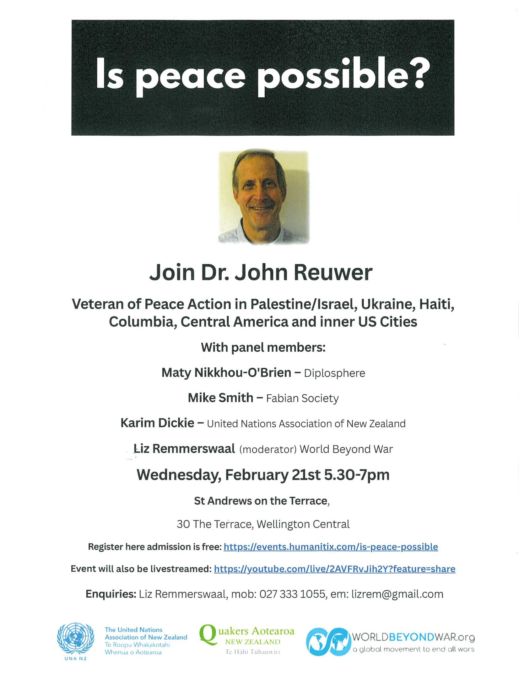 Presentation by Dr John Reuwer followed by a panel discussion. Wed 21 Feb 5.30-7 pm St Andrews on the Terrace. Hosted by World BEYOND War/Pacific Peace Network http://www.worldbeyondwar.com/