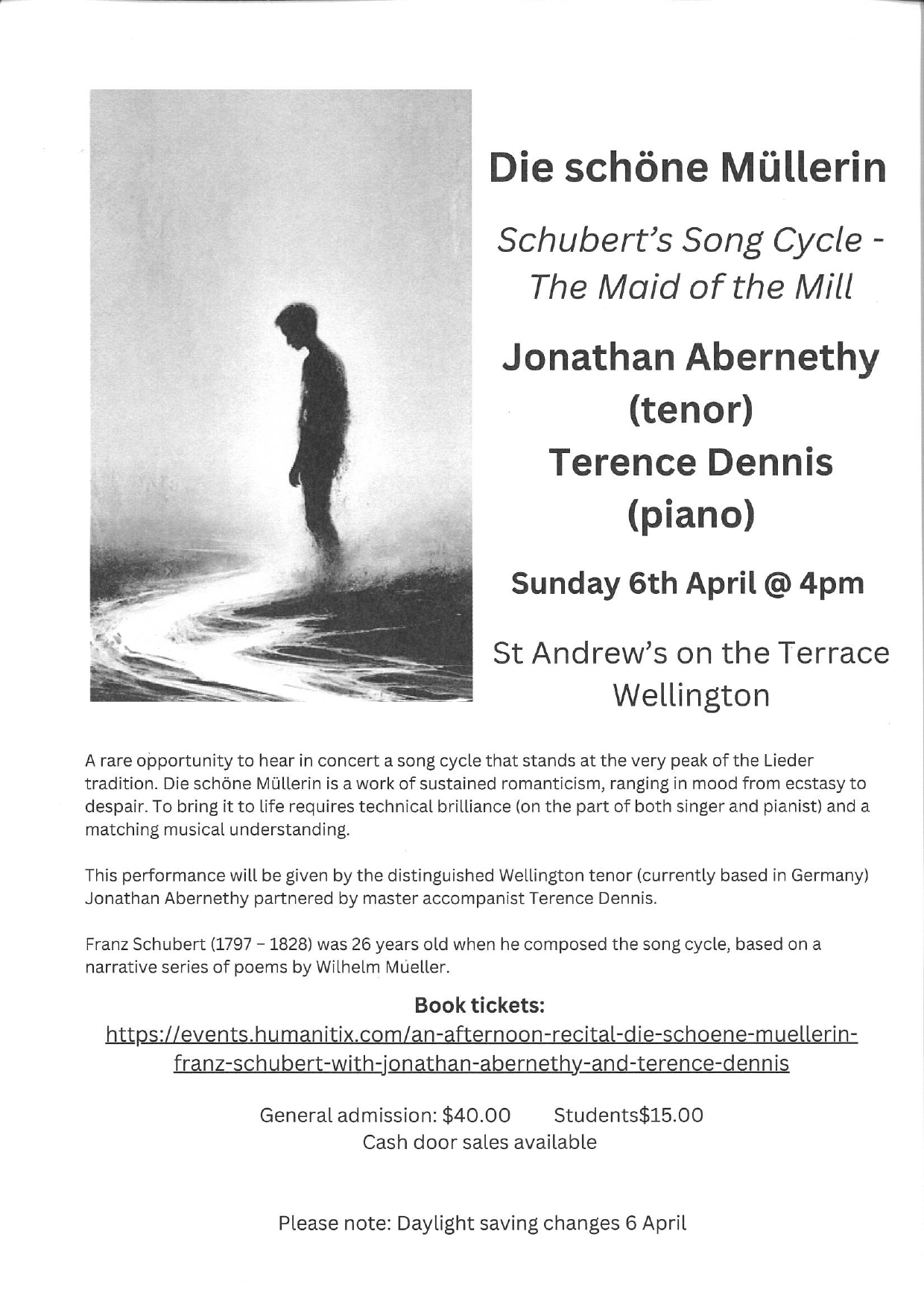 This performance will be given by the distinguished young Wellington tenor (currently based in Germany) Jonathan Abernethy partnered by master accompanist Terence Dennis.