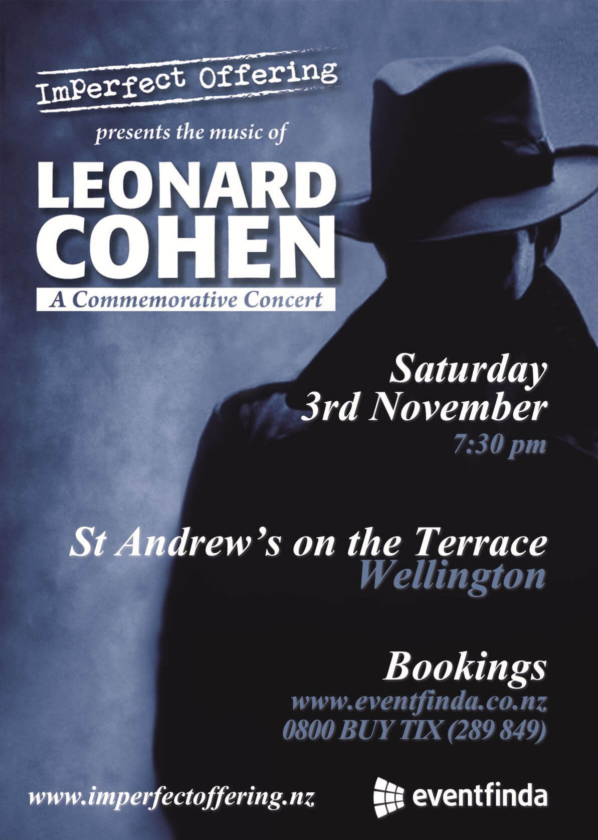 Imperfect Offering has appeared on TVNZ News on the event of Cohen’s death in November 2016 and was selected to be represented on the official Leonard Cohen website Cohencentric. Imperfect Offering have appeared at Q Theatre Auckland, Ascension Wine Estate Matakana, Tauranga, Hamilton and Century Theatre Napier. Imperfect Offering presents the best of Cohen’s music including the great “Hallelujah”, “Suzanne”, “Chelsea Hotel”, “The Future”, “Bird on the Wire” and songs from Cohen’s extraordinary last album You Want it Darker. Audiences have said: