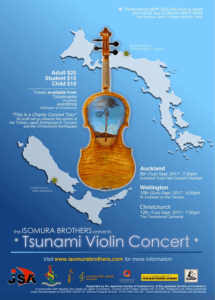 On behalf of the Japanese Society of Auckland, it is our pleasure to introduce the Isomura Brothers and their forthcoming Tsunami Violin Concert. This is a charity concert, and all the profits will go towards the victims of the Tohoku Earhquake/Tsunami of 2011.